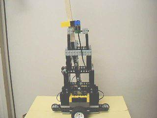 倒立振子ロボットをLEGOのブロックで作ってみました。 ロボットは台車と棒からできています。 台車には車輪、モータ、光センサー、コンピュータが載っています。 棒の先にある車輪は重りです。